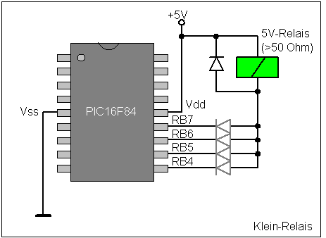 Die Belastbarkeit eines einzelnen Pins beträgt für den 16F84 25 mA (Low-Pegel) bzw. 20 mA (High-Pegel). Alle anderen Flash-PICs erlauben 25mA bei beiden Pegeln.