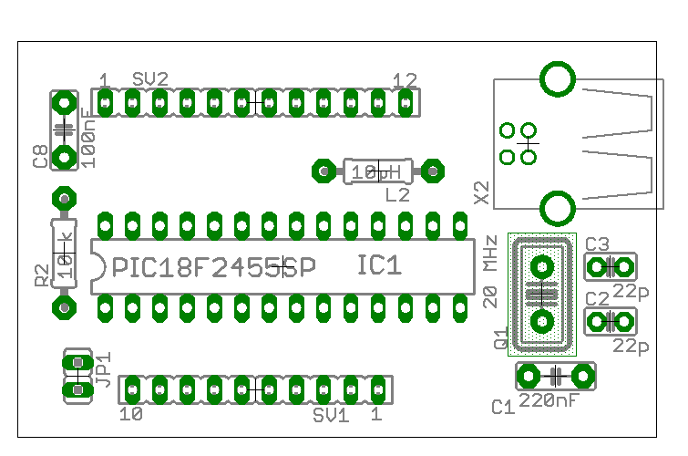 black-box into the own project, to solve all USB-problems. Such a solution exists: the IO-warrior-chips. They are available for a fair price and simplify the development of USB-devices. But they have some weaknesses too. Because of this, I made my own universal USB-interface-chip, based on a microchip PIC18F2455 microcontroller. This chip meets my specs and I call it USB4all. It is available in two "flavors":