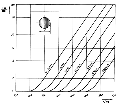 wächst mit der Frequenz. Das bedeutet zunächst einmal, dass die tiefen Frequenzen sowohl im Inneren der Drahtes wie auch auf seiner Oberfläche laufen. Sie würden durch so einen Spezialdraht also schnell (im Kern) wie auch verzögert (entlang den Riffeln auf der Oberfläche) zum Ziel kommen. Sie würden "verschmiert" werden. Und die hohen Frequenzen? Die Eindringtiefe eines 10 kHz-Signals (10000 Hz) in Kupfer beträgt noch etwa 1 mm. Da die Kabel im Audiobereich aus dünnen Drähten bzw. Litzen bestehen, und die Frequenzen nur 20 kHz erreichen, tritt der Skin-Effekt hier praktisch nicht auf. (erst bei Leiterquerschnitten über 3 mm2.) Die Grafik zeigt die Wirkung des Skineffektes (die sich als frequenzabhängige Widerstandsänderung bemerkbar macht) für verschiedene Drahtdicken. Der Effekt wirkt um so stärker, je dicker der Draht ist. Bei einem 1 mm dicken Draht beginnt der Skineffekt erst ab 20 kHz zu wirken. In dünneren Drähten wirkt der Skineffekt erst bei Frequenzen jenseits 100 kHz. |
