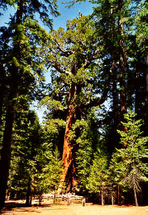 Die Redwoods im Yosemite Nationalpark (südlich des Yosemite Valley) sind zwar kleiner als die Redwoods in Küstennähe, aber ihr Durchmesser ist viel größer. Selbst der Ast, der aus diesem Baum aus halber Höhe nach rechts entwächst, ist dicker als der Stamm eines jeden Nicht-Redwood-Baums im Yosemite Nationalpark. |